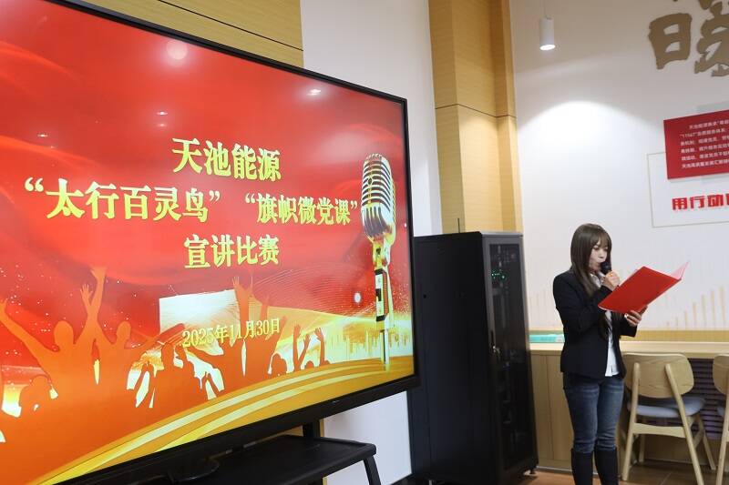 “我是‘太行百灵鸟’宣讲员田海停,今天宣讲的题目是《以青春之我,争做新时代的天池人》。总有一种力量让我们泪流满面,总有一种力量让我们精神抖擞,这种力量来自你、来自我、来自我们中间的每一个人——这,就是新时代天池人的力量!”11月30日,天池能源在新时代文明实践中心理论宣讲站隆重举办“太行百灵鸟”“旗帜微党课”宣讲比赛,来自两支宣讲队部分成员以及职工代表和评委团共35人齐聚一堂,用鲜活语言传递奋斗心声,以昂扬姿态凝聚发展力量。