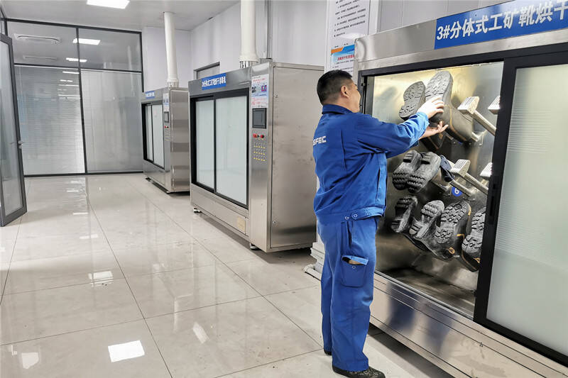 针对胶靴清洗干燥难题,专门引进2台工矿靴清洗机和3台工矿靴烘干消毒机。清洗时,高压动力水流能深入胶靴缝隙,将煤尘、污渍彻底冲洗干净;烘干阶段,热风循环系统可快速排出靴内湿气,同时完成消毒杀菌。整套流程实现程序化设计,操作人员只需按下启动按钮,就能一键完成胶靴清洗、烘干、消毒,让一线职工每天下井前,都能穿上干爽、洁净、无菌的胶靴,后顾之忧被彻底解决。