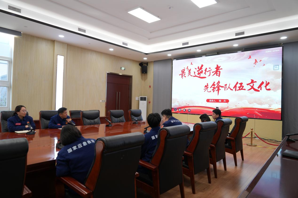 随后,综合办杨月以"最美逆行者"为主题作了队伍先锋文化宣讲。课程回顾了队伍发展历程,通过分享从平邑石膏矿救援到郑州暴雨抢险等多个重大任务中的感人事迹,以及在国际国内赛事中屡获殊荣的辉煌成就,生动诠释了救援铁军的精神传承与使命担当,进一步凝聚了队伍向心力、战斗力。